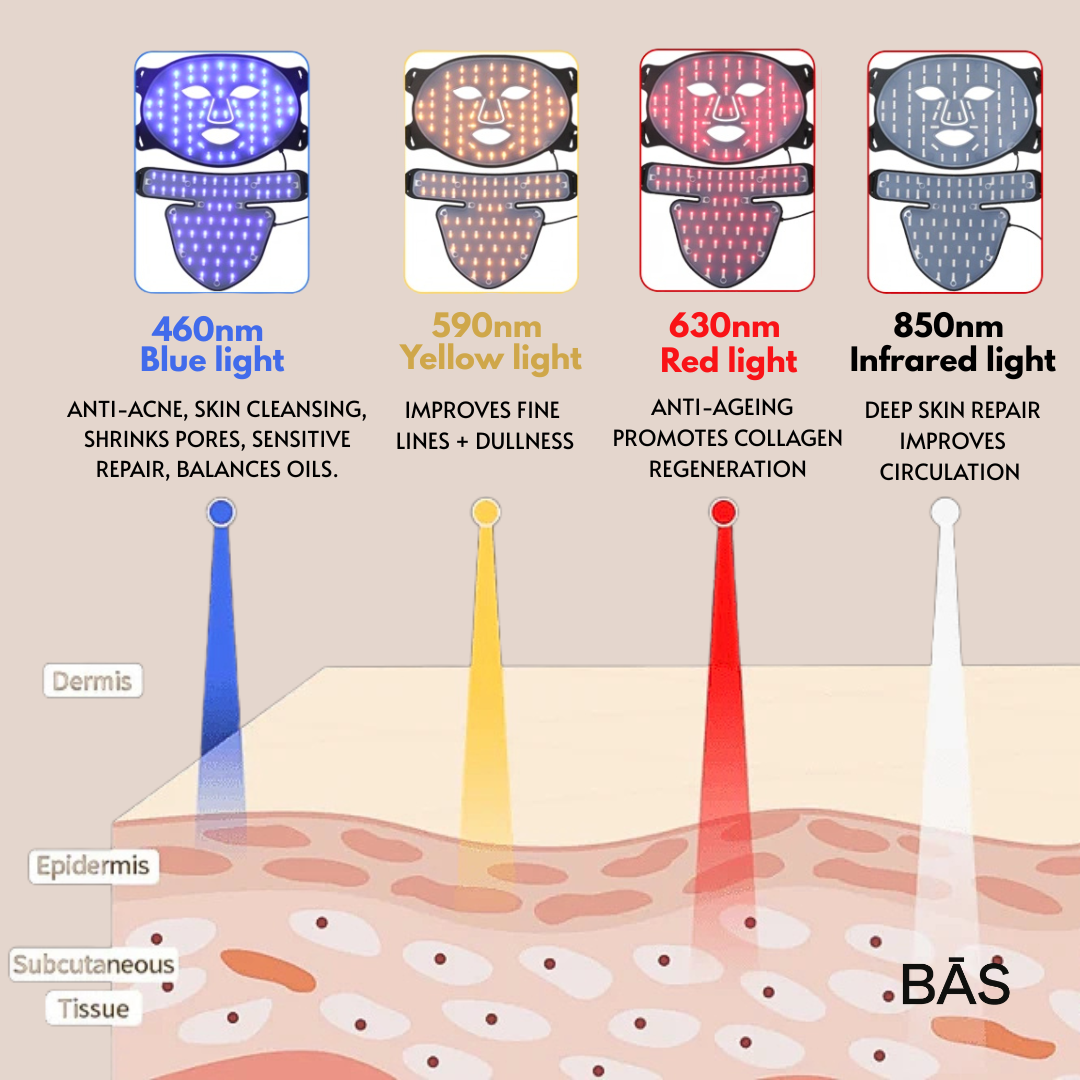 At BĀS Wellness, our LED Face & Neck Mask is built on the proven science of photobiomodulation - the ability of specific wavelengths of light to energise the skin at a cellular level. Each spectrum in our device plays a distinct role in restoring skin health. 460nm blue light targets the skin’s surface, helping to reduce congestion and refine clarity. 590nm amber light calms visible redness and supports a more even, luminous tone. 630nm red light penetrates deeper to stimulate collagen, smooth fine lines, and enhance overall firmness. The most powerful of all, 850nm near-infrared light, travels beyond the upper layers of skin and reaches deeper tissues, where it supports cellular repair, improves circulation, reduces inflammation, and encourages long-term rejuvenation. Together, these wavelengths work in harmony to strengthen the foundation of your skin - from surface clarity to deep structural renewal - creating visible radiance that’s backed by science, not guesswork.