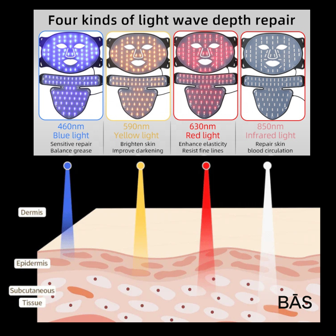 At BĀS Wellness, our LED Face & Neck Mask is built on the proven science of photobiomodulation — the ability of specific wavelengths of light to energise the skin at a cellular level. Each spectrum in our device plays a distinct role in restoring skin health. 460nm blue light targets the skin’s surface, helping to reduce congestion and refine clarity. 590nm amber light calms visible redness and supports a more even, luminous tone. 630nm red light penetrates deeper to stimulate collagen, smooth fine lines, and enhance overall firmness. The most powerful of all, 850nm near-infrared light, travels beyond the upper layers of skin and reaches deeper tissues, where it supports cellular repair, improves circulation, reduces inflammation, and encourages long-term rejuvenation. Together, these wavelengths work in harmony to strengthen the foundation of your skin — from surface clarity to deep structural renewal — creating visible radiance that’s backed by science, not guesswork.